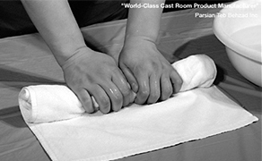 - باند را بر روی حوله ای بزرگتر قرار داده و به آرامی آنرا لوله نموده تا آخرین مقدار آب اضافی نیز گرفته شود.